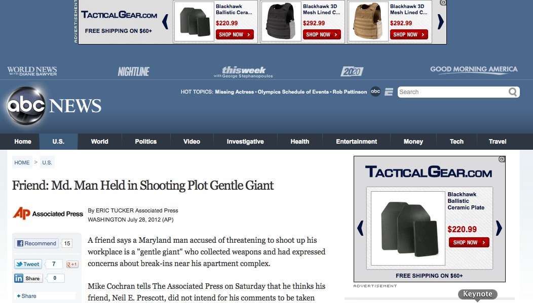 Ads for bullet proof vests and armor plate embedded in a story about someone who apparently threatened to duplicate the Aurora theater shooting? I don’t know if the content server’s analytics are genius or shit… I mean, reading about someone shooting up the movie theater or workplace might make me want to buy body armor, on the other hand, if I were to be in the bullet proof vest business, do I really want customers associating me with people who go ballistic (oops a pun) and shoot their coworkers or fellow movie watchers? Probably not.