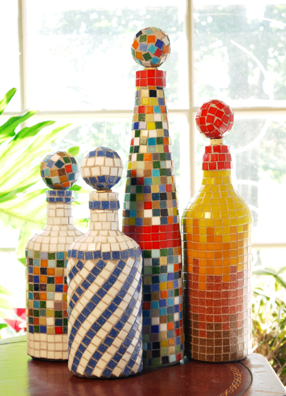 Collection of Mosaic Bottles with stoppers. The smallest is >12 inches tall; the tallest is 17+ inches.
